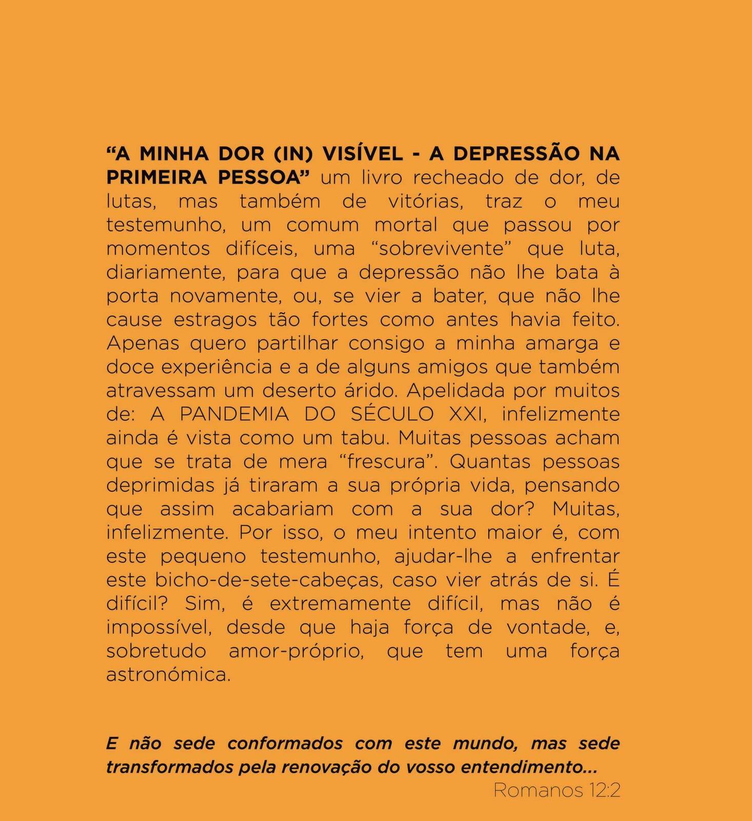 Estou lendo este livro com enorme interesse pelo seu conteúdo e pela admiração que sinto pela autora. Nunca imaginei a Geraldina tão afoite à pena e ser uma mulher com essa coragem e determinação. A sua fé inabalável, associada à força imensurável de enfrentar uma doença que só ela conhecia a amplitude, faz dela uma mulher ímpar , respeitável e admirada por todos. Durante a doença (silenciosa) foi capaz de frequentar e concluir um mestrado, tendo ainda em curso um doutoramento, tudo isso e muito mais, sem falarmos do trabalho e da família, mostra que estamos na presença de uma mulher invulgar. Por ela e pelo seu livro, começo a perceber a dimensão de um doente deprimido. Por este livro também percebo a força da fé e da crença em Deus Pai Todo- Poderoso. Uma força que nos faz acreditar que é possível vencer os desafios por mais fortes que pareçam. Estou encantado com o livro e não me canso de o ler. É uma escola e estou convencido que ao tê-lo lido na totalidade, terei visto o mundo diferente, um mundo para o qual a Geraldina terá dado o seu contributo. Obrigado por me teres proporcionado esta visão.